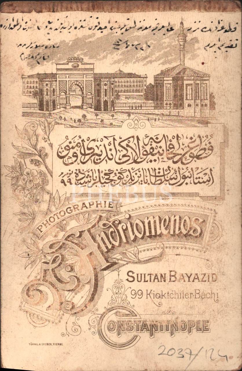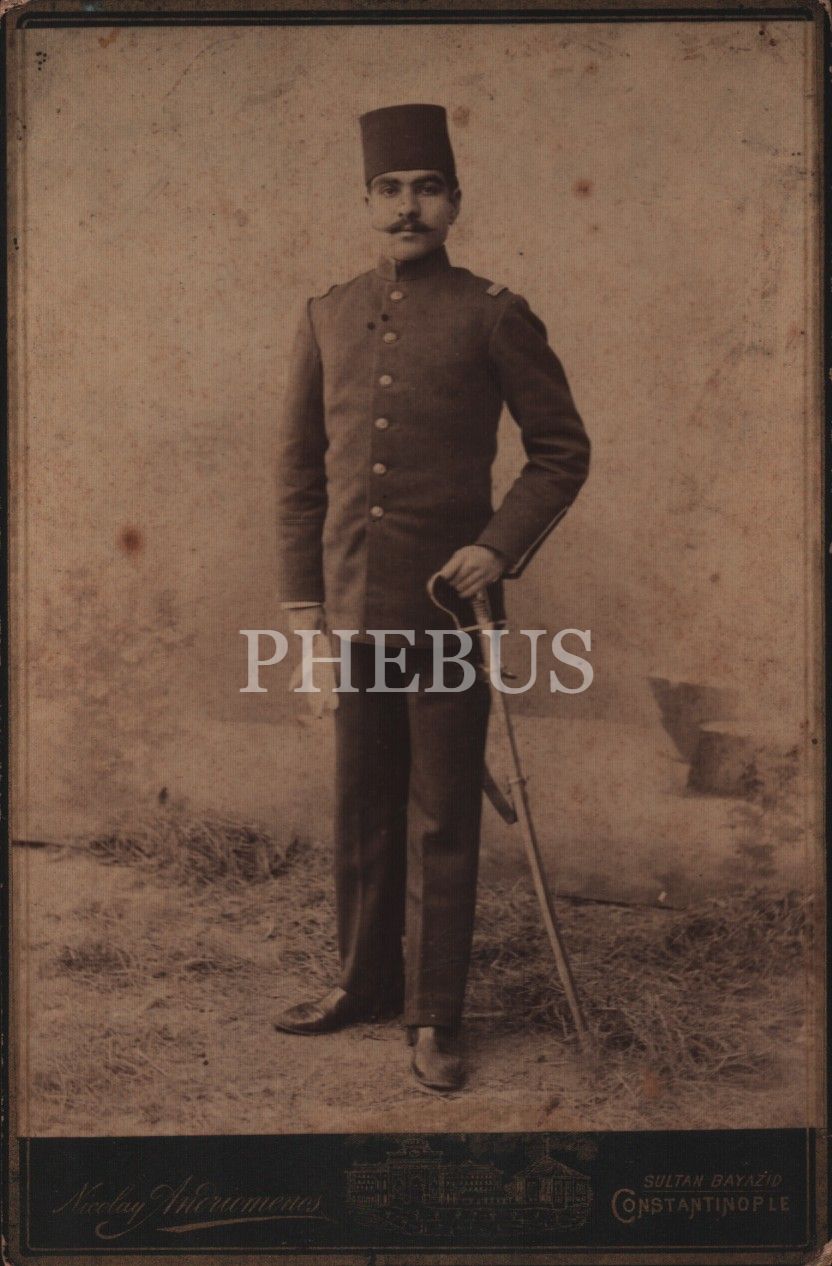 Kılıcıyla poz veren Osmanlı askeri, hicri 1300´lü yıllara ait ithaf yazısıyla, Nicolay Andriomenos Fotoğrafhanesi-Constantinople, 11x16 cm