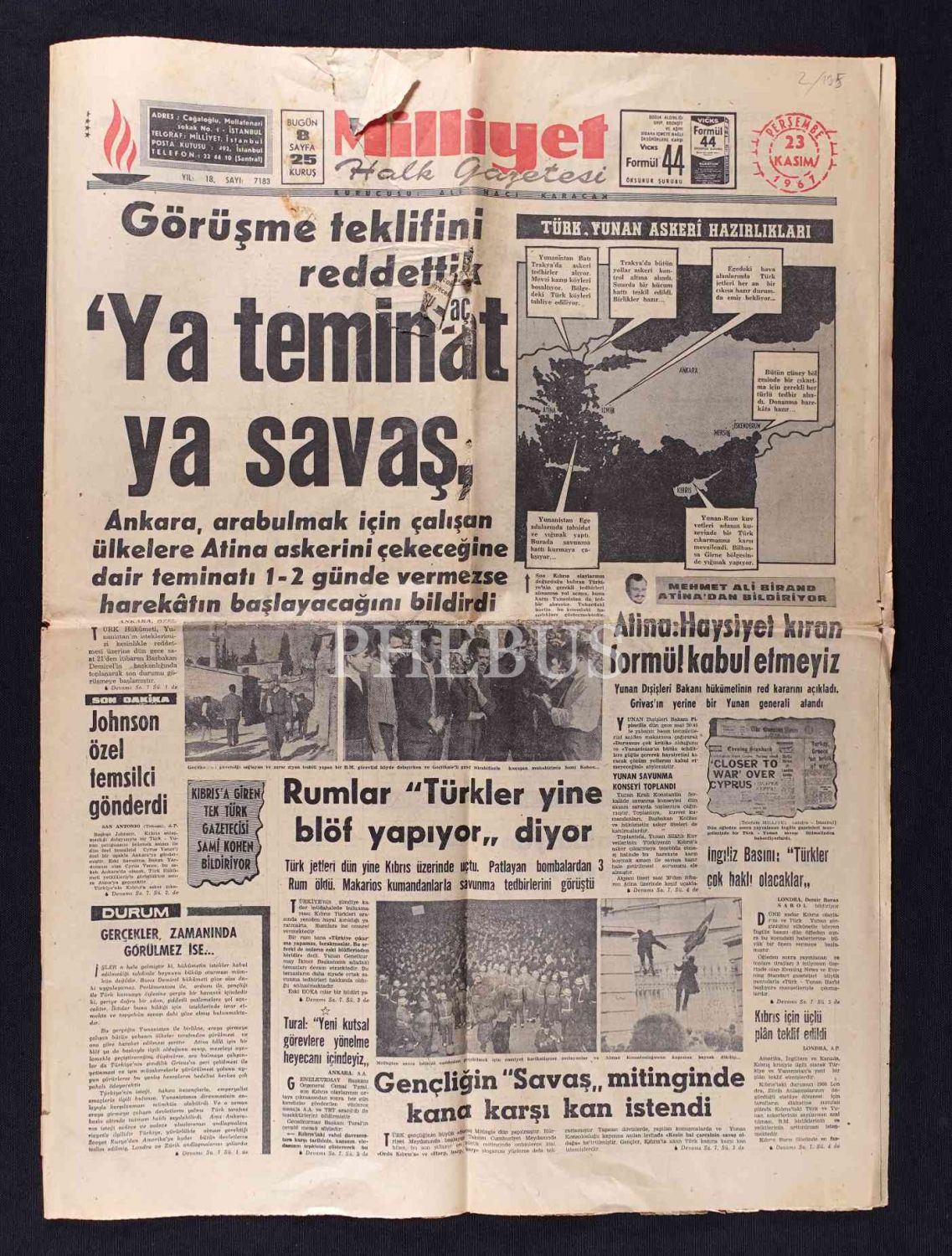 Milliyet gazetesinin Türk-Yunan askerî hazırlıklarına ilişkin manşet haberiyle Kasım 1961 tarihli sayısı, 42x59 cm