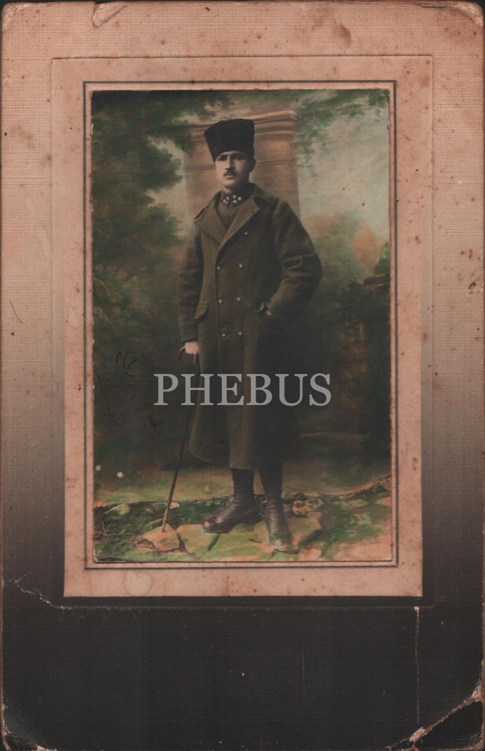 Bastonuyla poz veren kalpaklı Osmanlı subayı, 1339 tarihli ithaf yazısıyla, 14x22 cm