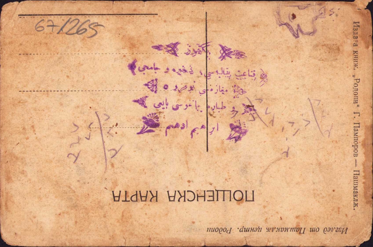 Osmanlıca; Kanaat bakkaliyesi, zahiresi ve camcı mağazası no.5 - İbrahim Ethem damgalı kartpostal