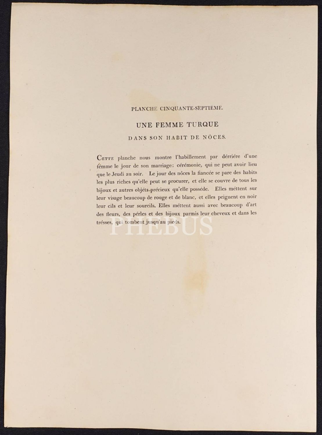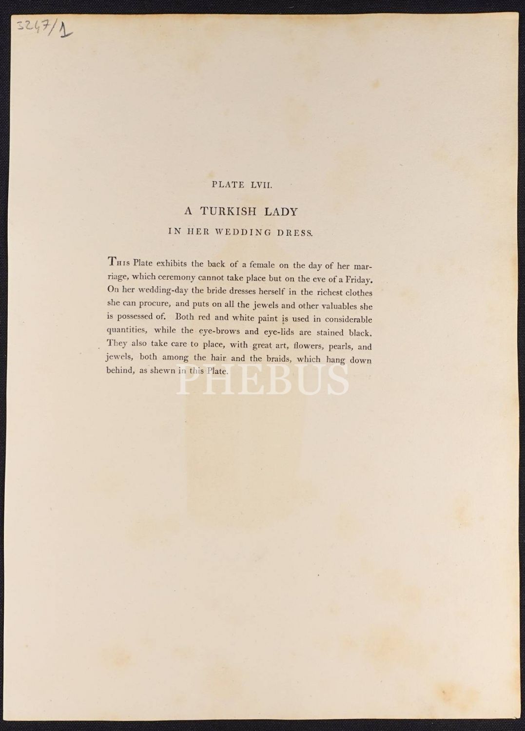 Octavian Dalvimart´ın 1802 baskı THE COSTUME OF TURKEY kitabından taş baskı "Gelinlikli Türk Kadını" [A Turkish Lady - In Her Wedding Dress] gravürü, İngilizce-Fransızca açıklamalarıyla birlikte, 25x35 cm