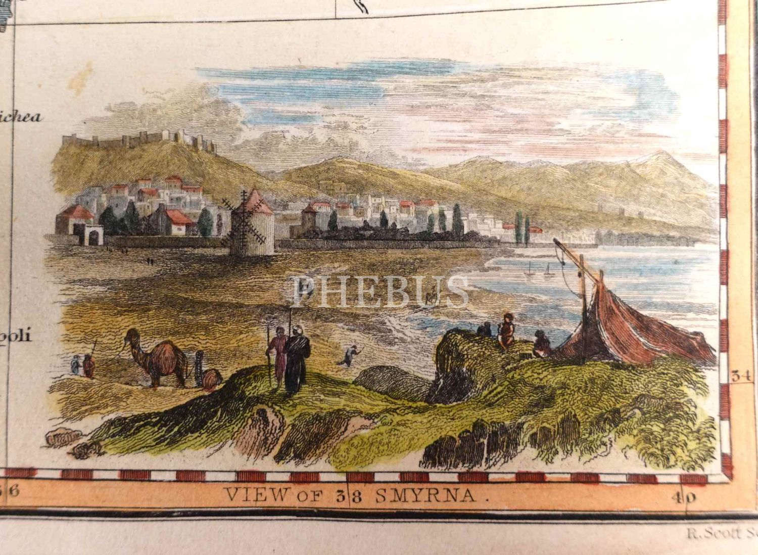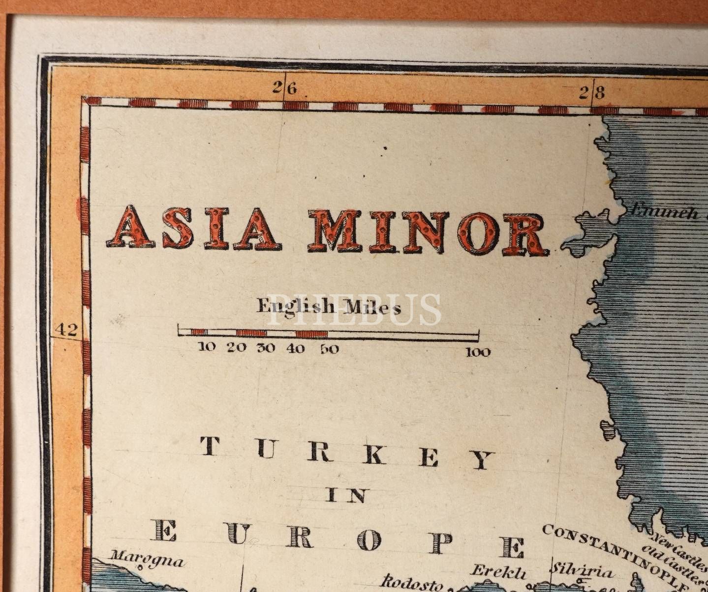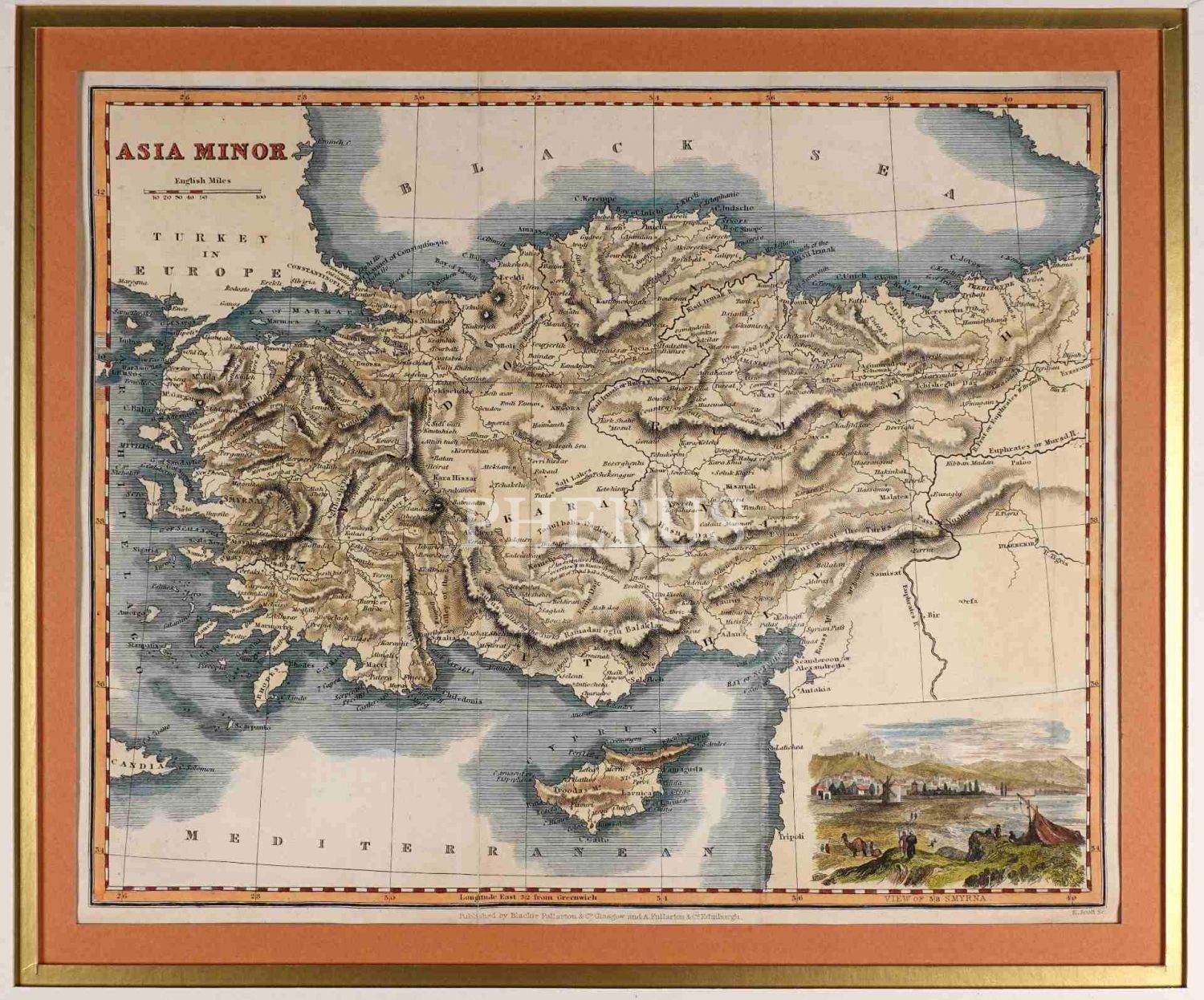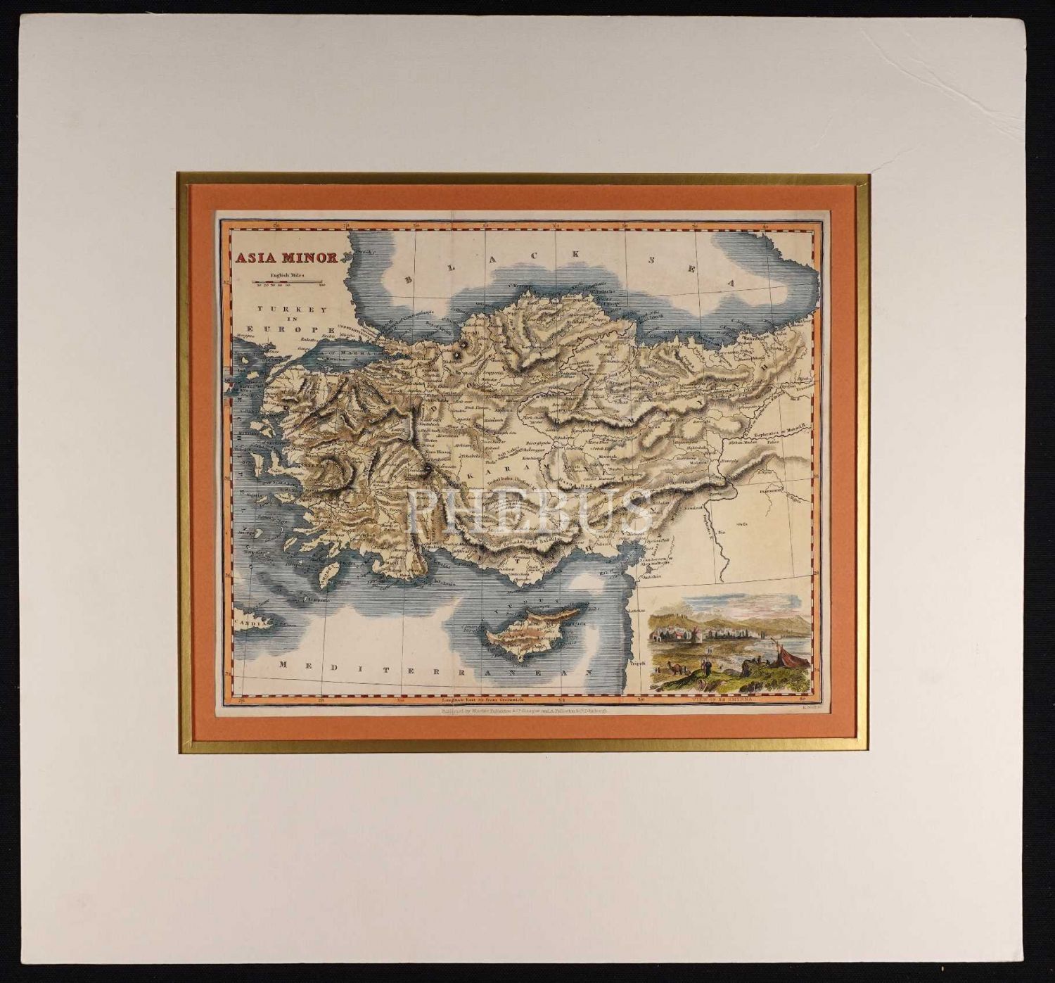 "İzmir Manzarası" detayıyla birlikte İngilizce ASIA MINOR [Küçük Asya / Anadolu] haritası, Blackie Fullarton & C. Glasgow - A. Fullarton & C. Edinburgh, paspartusuyla birlikte 42x40 cm