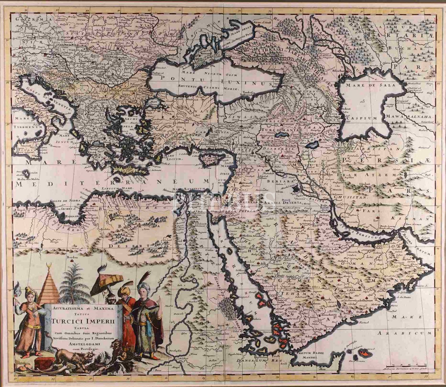 Hollanda´nın önde gelen coğrafi harita yayıncısı ailelerinden biri olan Danckerts ailesine mensup olan Justus Danckerts (1635-1701) tarafından yayımlanan harita, Mısır, Yunanistan ve Arap yarımadası dahil olmak üzere dönemin Osmanlı İmparatorluğu topraklarını ayrıntılı bir şekilde göstermektedir. Sol alt köşede yer alan harita künyesinin etrafı kostümlü Osmanlı tipler, aslanlar ve çadır gibi egzotik görsellerle süslenmiştir.