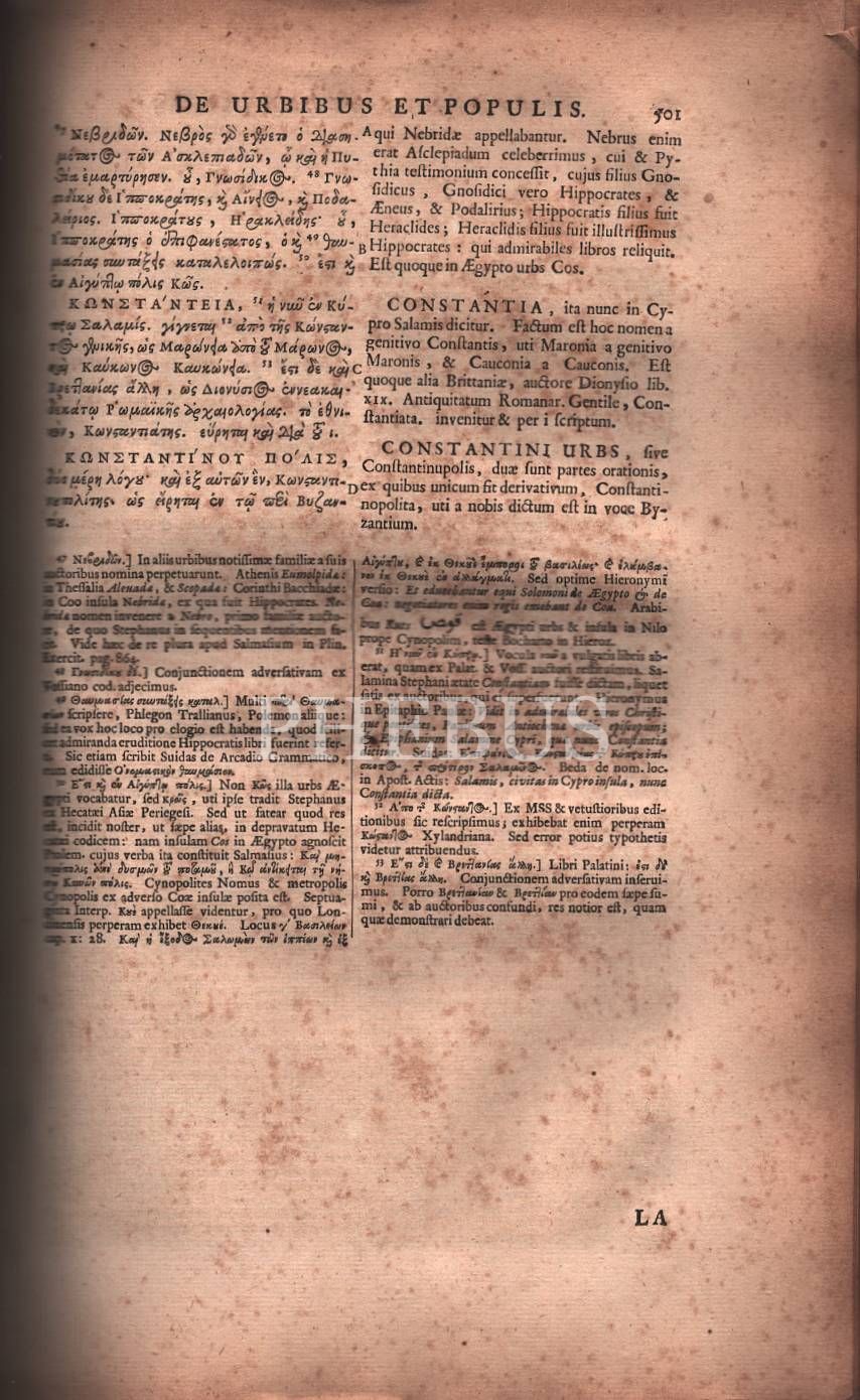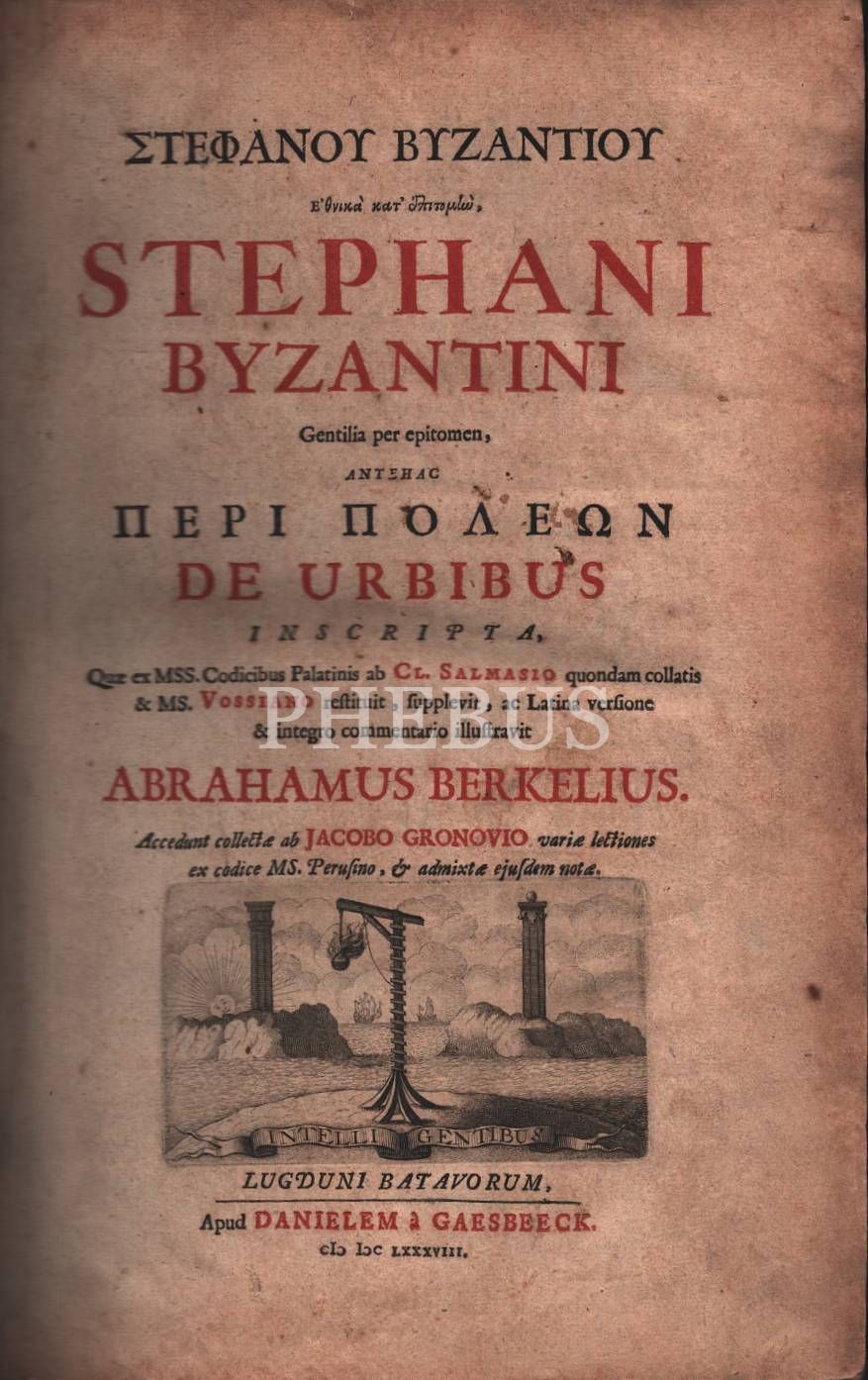 Dilbilgisi uzmanı Bizanslı Stephanos´un ŞEHİRLER VE HALKLAR ÜZERİNE adlı eserinin Abraham van Berkel tarafından 1688 yılında yayımlanan edisyonu, Latince ve Yunanca, 786+27 sayfa, 21x32 cm