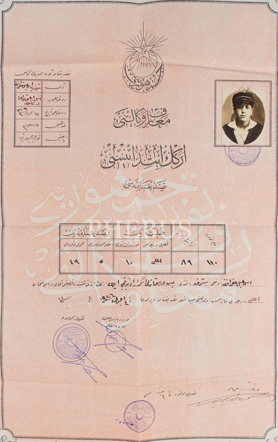 Eğitim tarihi: fotoğraflı erkek ilkokulu diploması, Üsküdar/İstanbul 1926, 34x49 cm