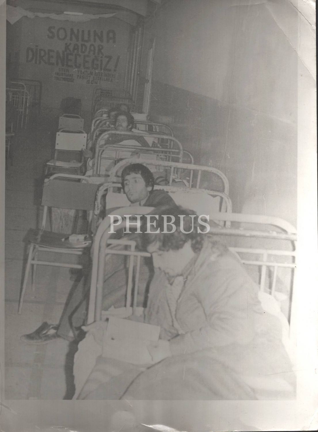 Siyaset tarihi: "Yurtlar üzerindeki faşist baskılara son!" yazısının görüldüğü odada Site Yurdu direnişi, 18x24 cm