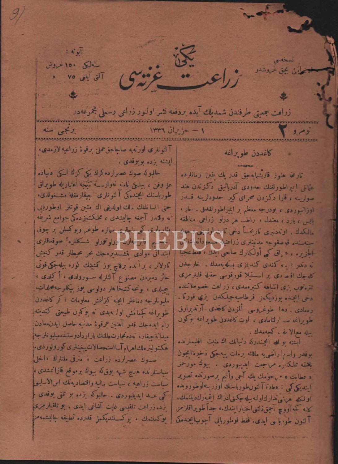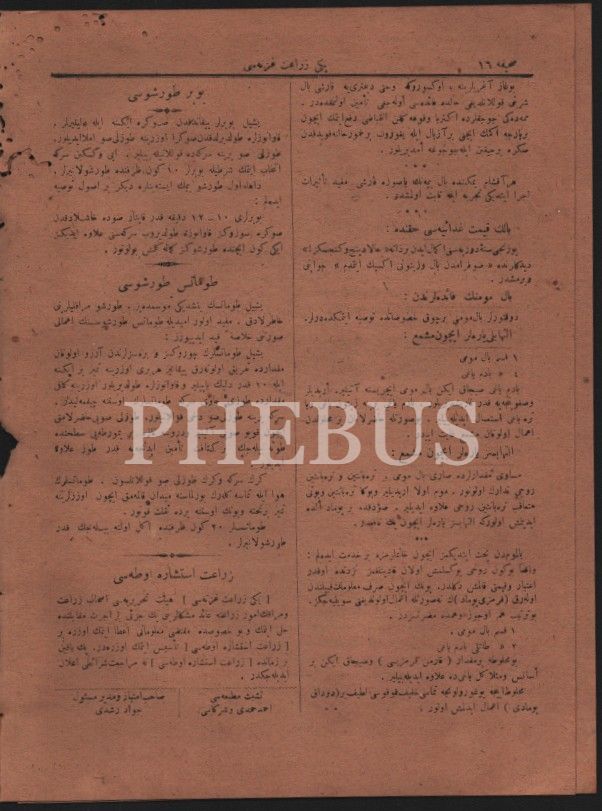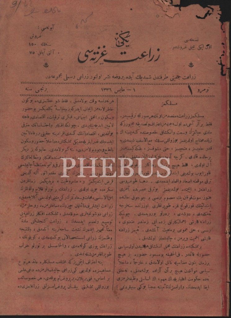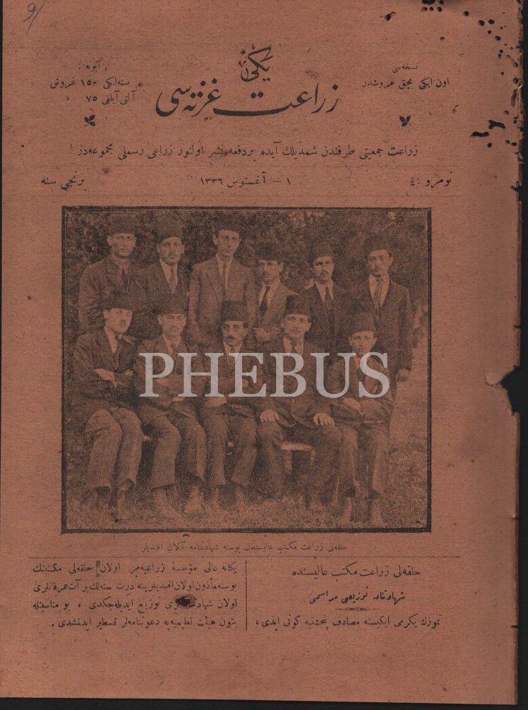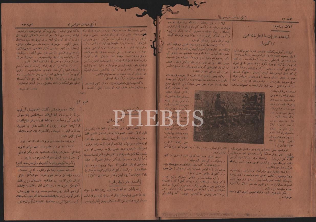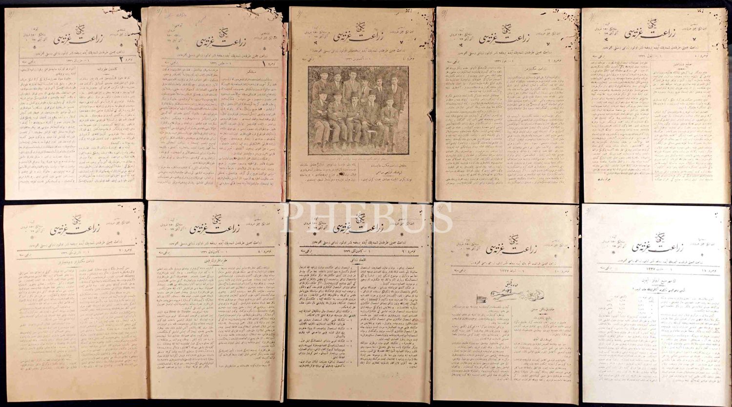 Tarım tarihi: YENİ ZİRAAT GAZETESİ´nin 1336-40 yıllarında yayımlanan 43 sayısı bir arada, 19x26 cm, birkaçının üst kısmında kurt yenikleri mevcut haliyle