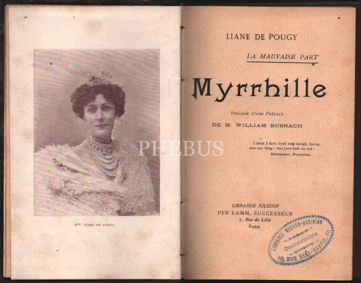 Fransızca MYRRHILLE, Liane De Pougy, Paris, "Librairie Nichan-Babikian-Constantinople" damgalı, 214 s., 12x18 cm