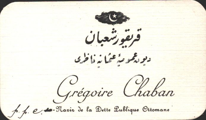 Duyun-ı Umumiye-i Osmaniye Nazırı Gregoire Şaban´a ait ay yıldızlı Osmanlıca-Fransızca kartvizit