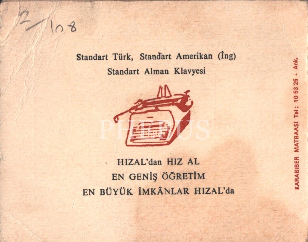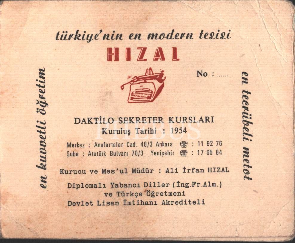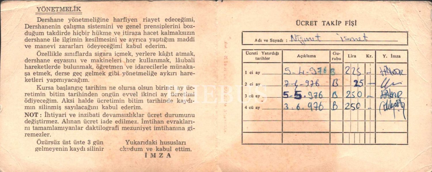 "Türkiye´nin en modern tesisi" Hızal Daktilo Sekreter Kursları ücret takip fişi, 1976 tarihli, 10x25 cm