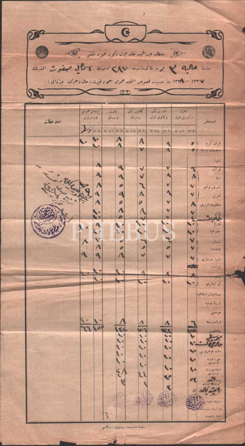 Eğitim tarihi: Sultan Abdülhamid Han-ı Evvel Erkek Numune Mektebi imtihan sonuç kâğıdı, 1338 tarihli, 21x38 cm