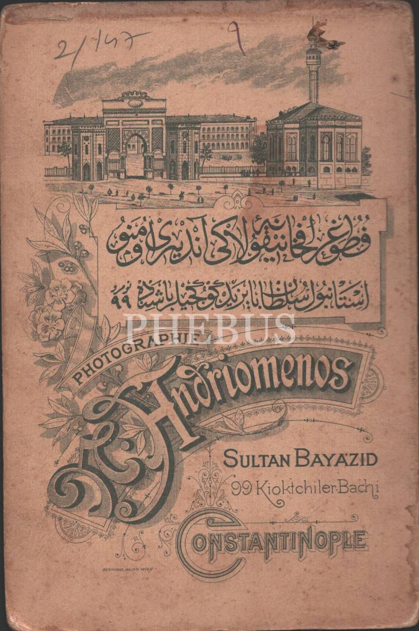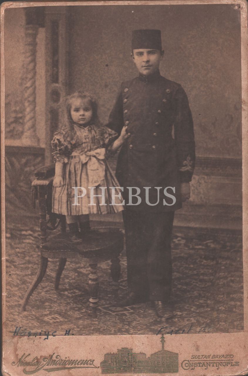 Askerî öğrenci ve sevimli miniğin hatıra pozu, Nicolay Andriomenos Fotoğrafhanesi- Constantinople, 11x16 cm