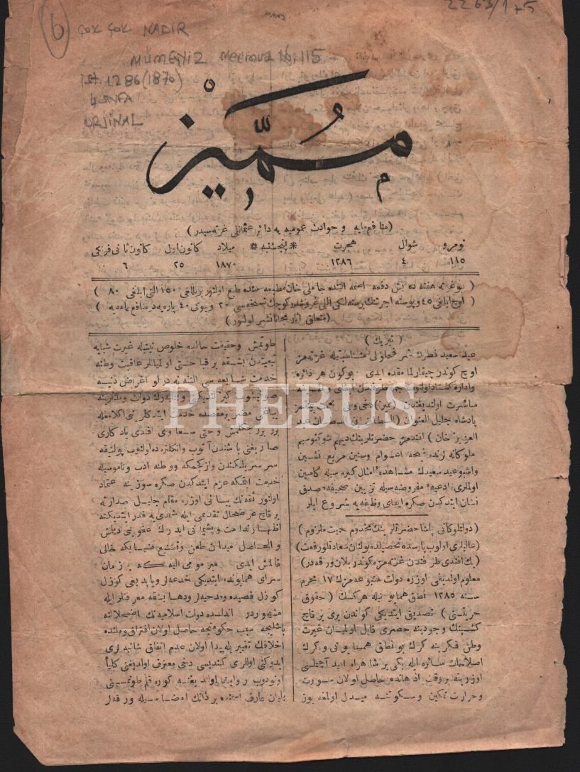 Çok nadir "milli menfaatlere ve genel hadiselere dair Osmanlı gazetesi" MÜMEYYİZ´in 25 Kanun-ı Evvel 1870 tarihli sayısı, 21x30 cm
