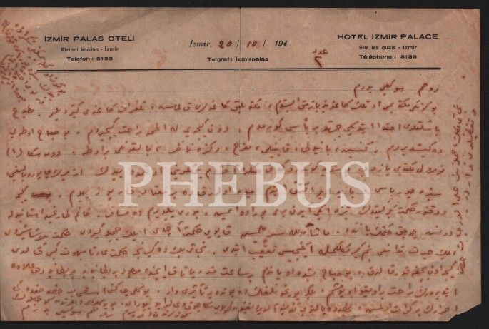 İzmir Palas Oteli antetli kâğıtta 1940´lı yıllarda yazılmış şahsi mektup, 15x23 cm