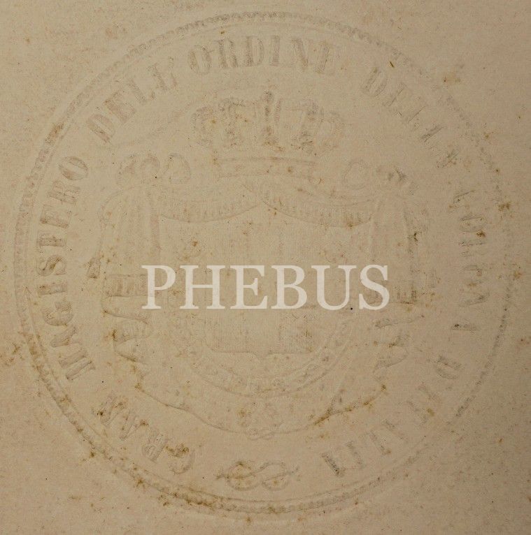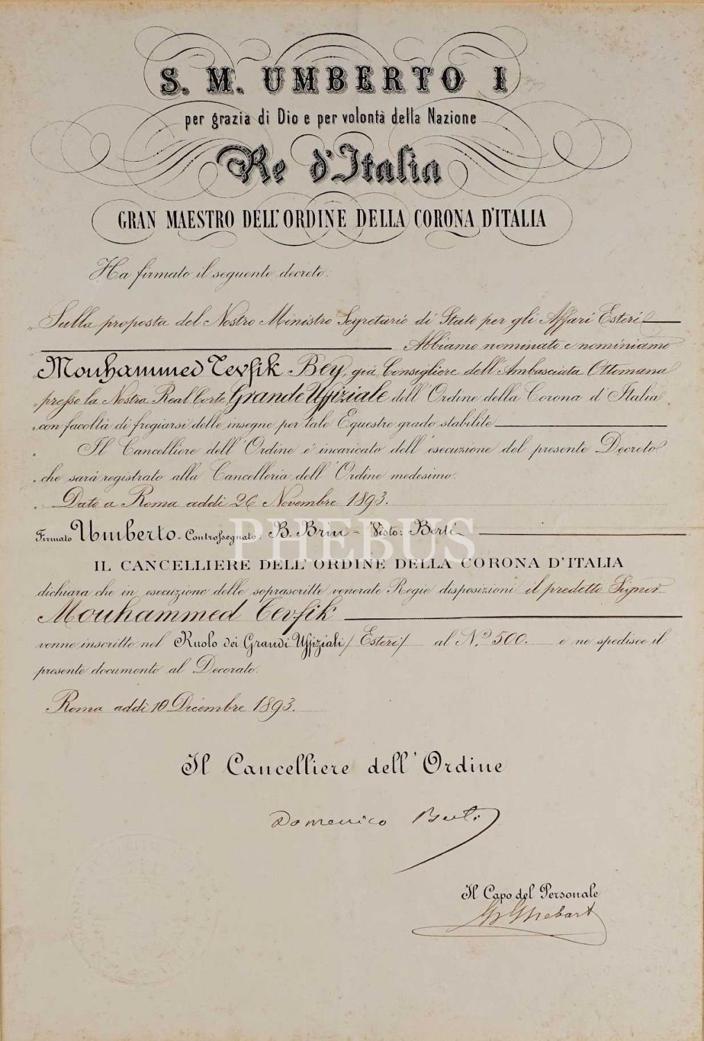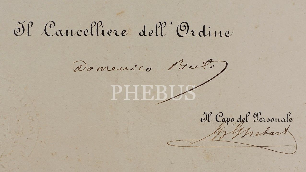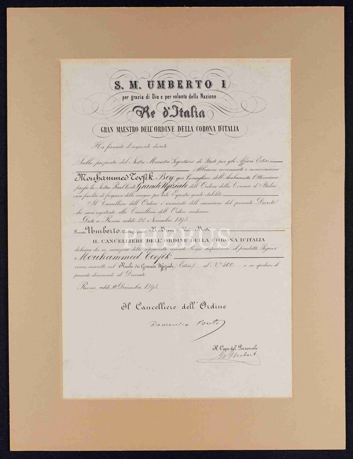 Muhammed Tevfik adlı kişiye ilişkin İtalyanca belge, Roma 1893, paspartu, 35x46 cm