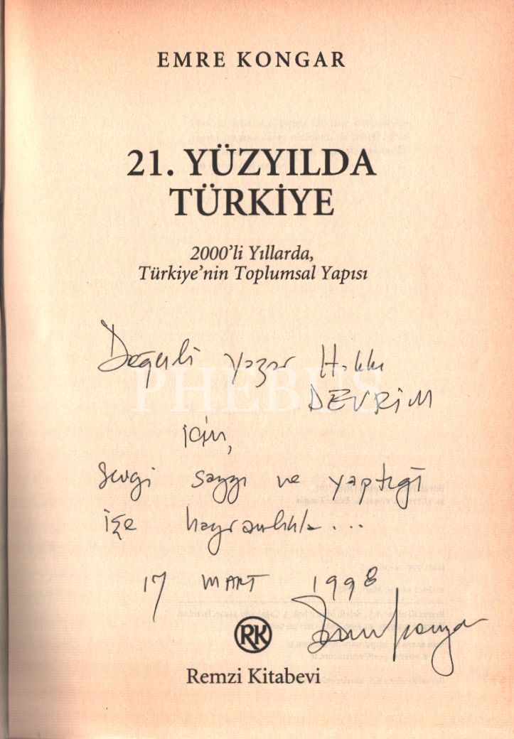 Emre Kongar´dan Hakkı Devrim´e ithaflı ve imzalı 21. YÜZYILDA TÜRKİYE - 2000´Lİ YILLARDA TÜRKİYE´NİN TOPLUMSAL YAPISI-, Remzi Kitabevi, Mart 1998, 725 sayfa, 16x24 cm