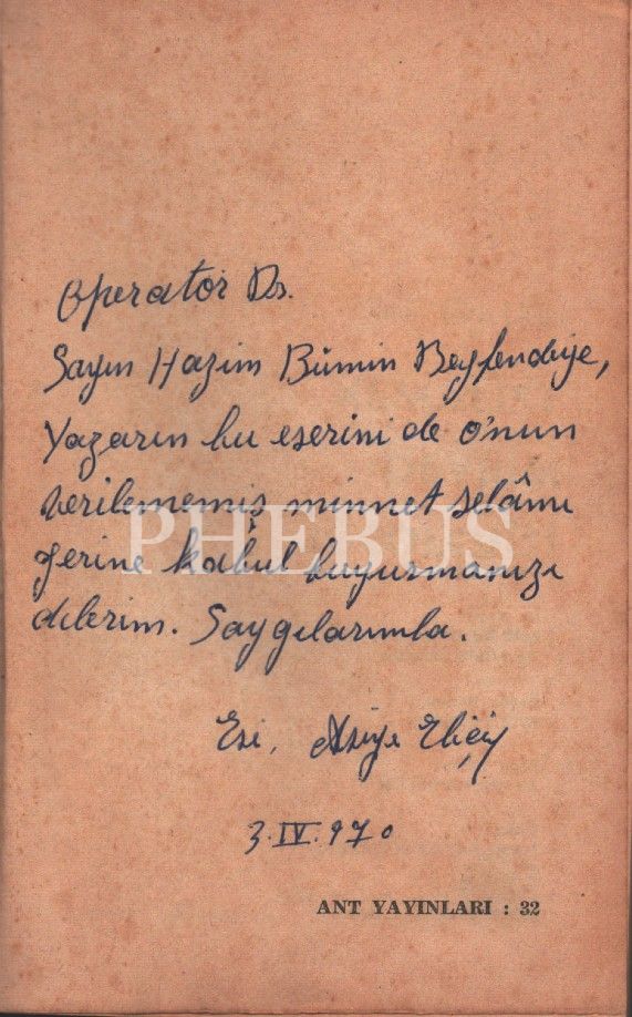 İthaf, "Muhterem Dr. Sayın Hazim Bümin Beyfendiye, yazarın bu eserini de O´nun verilememiş minnet selâmı yerine kabul buyurmanızı dilerim. Saygılarımla. Eşi, Asiye Eliçin 3.IV.970" şeklindedir.