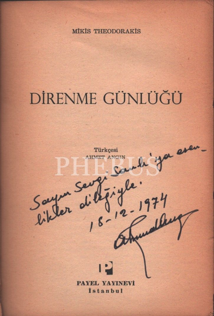 Çeviren Ahmet Angın´dan Sevgi Sanlı´ya ithaflı ve imzalı DİRENME GÜNLÜĞÜ, Mikis Theodorakis, Payel Yayınevi, İstanbul - Kasım 1974, 415 sayfa