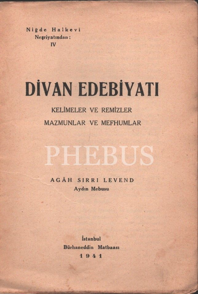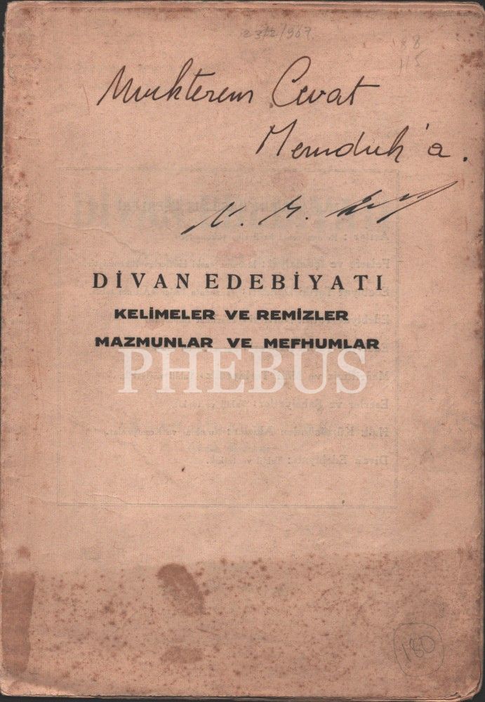 Agâh Sırrı Levend´ten Cevdet Memduh [Altar]´a ithaflı ve imzalı DİVAN EDEBİYATI -KELİMELER VE REMİZLER / MAZMUNLAR VE MEFHUMLAR, Bürhaneddin Matbaası, İstanbul - 1941, (MÜZAYEDEYE SUNDUĞUMUZ ESER, 456 SAYFALIK KİTABIN İLK 16 SAYFASINDAN İBARETTİR!)
