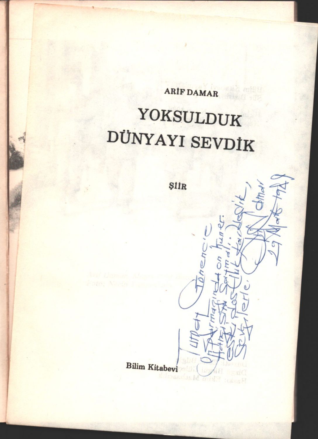 Arif Damar´dan Turgay Gönenç´e ithaflı ve imzalı YOKSULDUK DÜNYAYI SEVDİK, Bilim Kitabevi, Nisan 1988, 64 sayfa