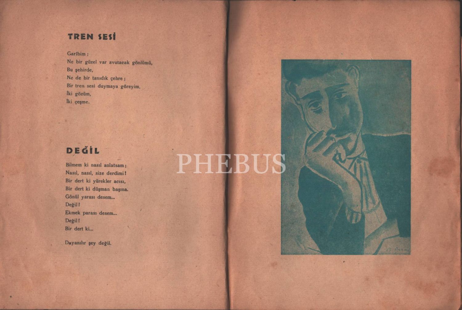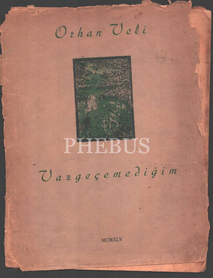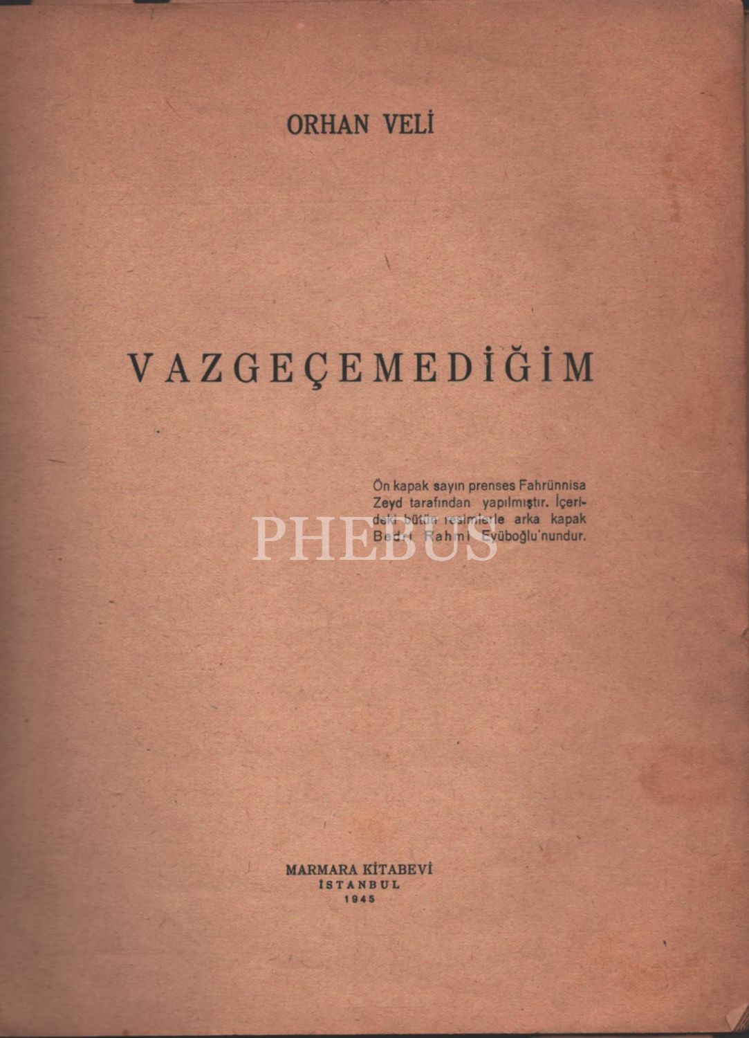 VAZGEÇEMEDİĞİM, Orhan Veli, Marmara Kitabevi, İstanbul - MCMXLV [1945], 16 sayfa, 18x24 cm, epey yıpranmış ve sayfaları birbirinden ayrılmış haliyle