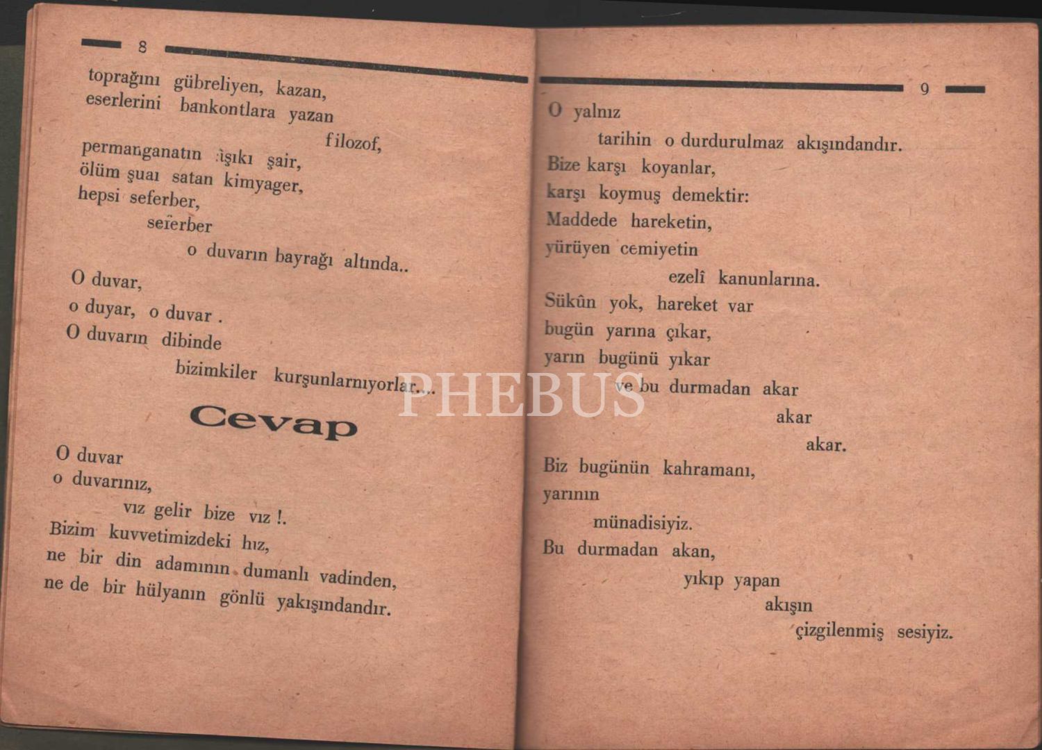 Kitap, “Duvar - Sükût - Meşin kaplı kitap- Yeni sanatın akını- Kadavra - Dışarııı Dışarı!” şiirlerini ihtiva etmektedir. Formaları açılmamış çil kondüsyonda bir birinci baskıdır.