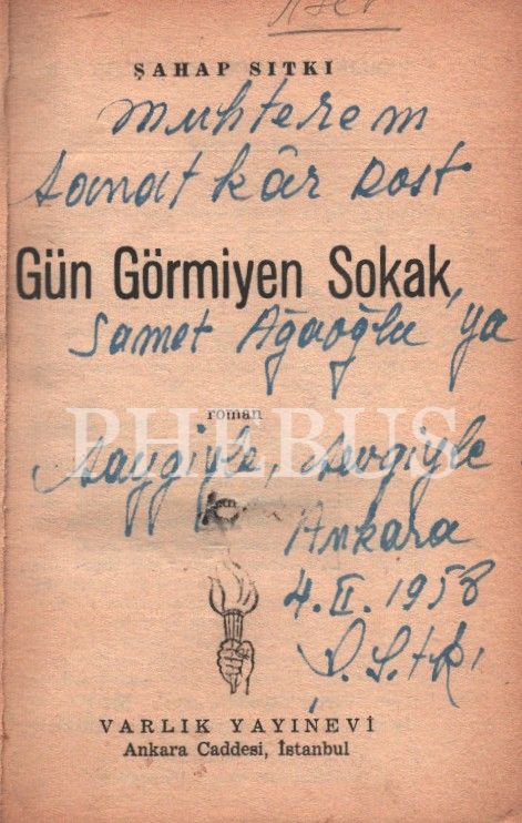 Şahap Sıtkı´dan Samet Ağaoğlu´na ithaflı ve imzalı GÜN GÖRMİYEN SOKAK, Varlık Yayınevi, Ocak 1958, 168 sayfa