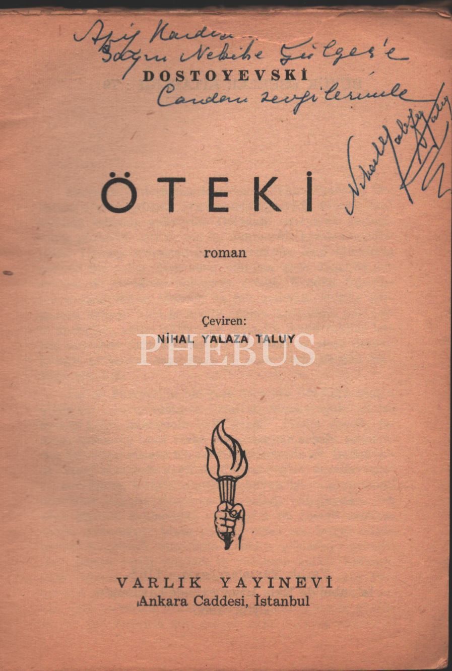 Çeviren Nihal Yalaza Taluy´dan ithaflı ve imzalı ÖTEKİ, Dostoyevski, Varlık Yayınevi, Eylül 1965, 157 sayfa