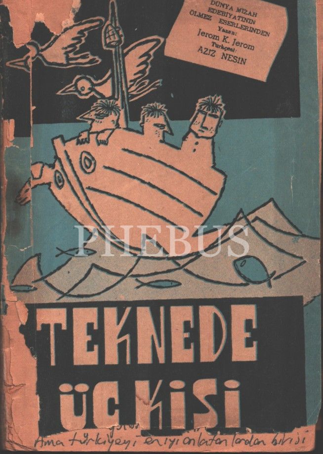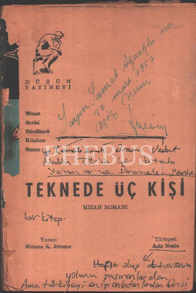 Çeviren Aziz Nesin´den Samet Ağaoğlu´na ithaflı ve imzalı TEKNEDE ÜÇ KİŞİ -Mizah Romanı-, Jerom K. Jerom, Düşün Yayınevi, İstanbul - 1957, 123 sayfa, ön ve arka kapağı kopuk, sırtı yıpranmış haliyle