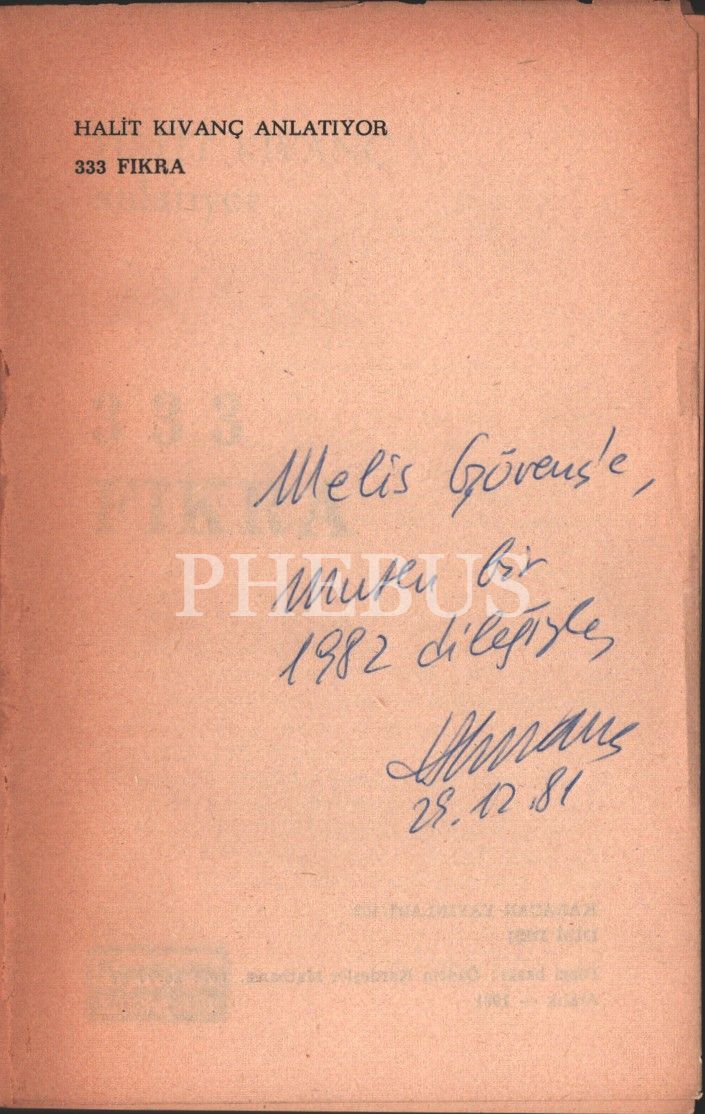 İthaf, "Melis Güvenç´e mutlu bir 1982 dileğiyle Halit Kıvanç 29.12.81" şeklindedir.