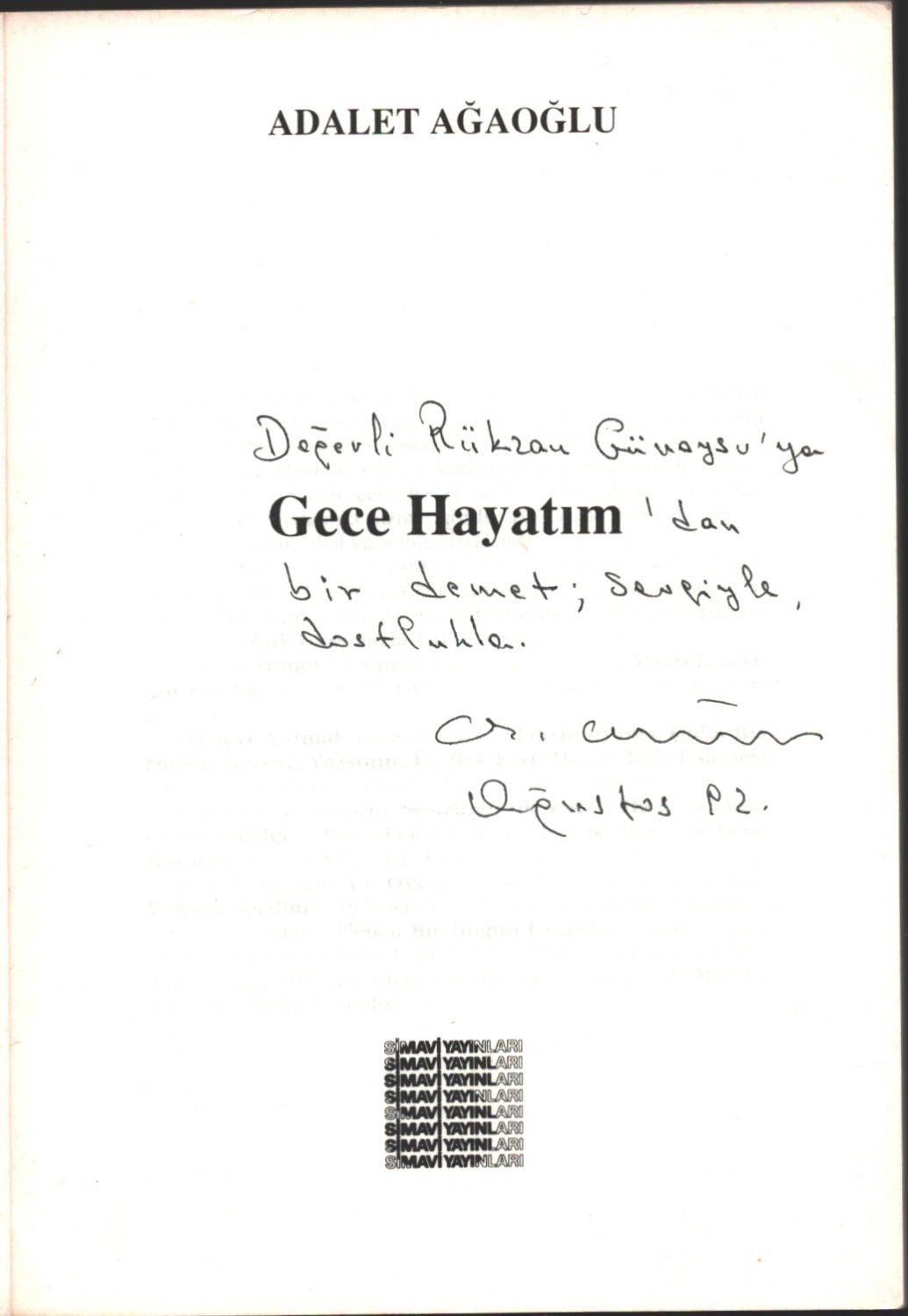 Adalet Ağaoğlu´ndan Rükzan Günaysu´ya ithaflı ve imzalı GECE HAYATIM, Simavi Yayınları, 1992, 140 sayfa