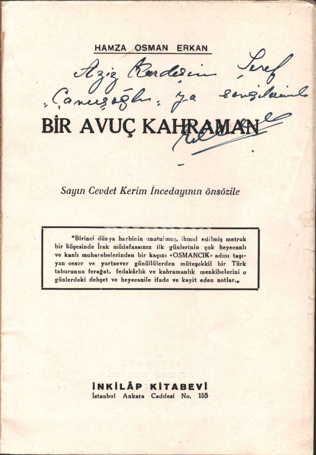 Hamza Osman Erkan´dan ithaflı ve imzalı BİR AVUÇ KAHRAMAN, İnkılâp Kitabevi, İstanbul - 1946, 32 sayfa