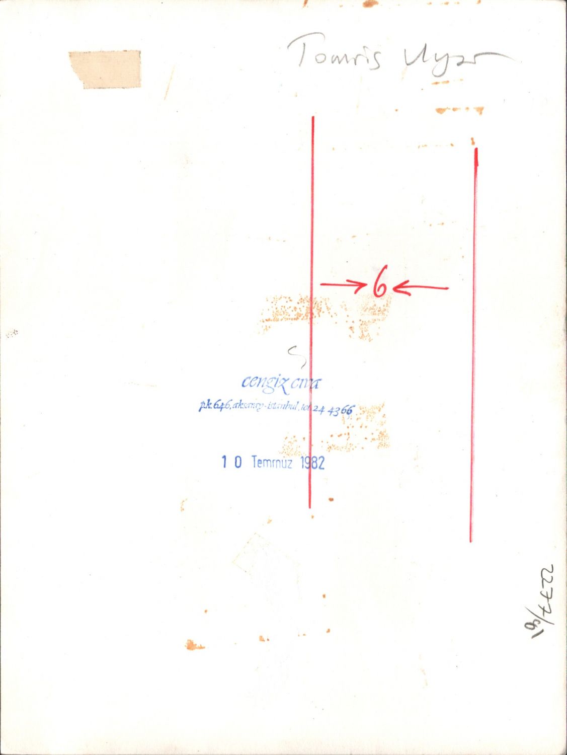 Cengiz Cıva´nın objektifinden Tomris Uyar, arka yüzü "Cengiz Cıva - 10 Temmuz 1982" kaşeli, 18x24 cm, fotoğrafın küçük bir bölümünde deforme mevcuttur