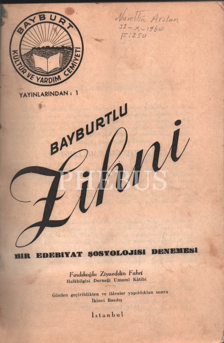 BAYBURTLU ZİHNİ- BİR EDEBİYAT SOSYOLOJİSİ DENEMESİ, Fındıkoğlu Ziyaeddin Fahri, Ülkü Basımevi, 1950