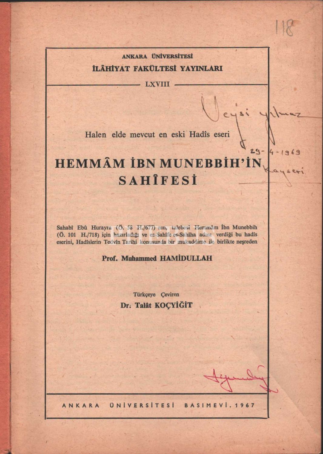 HEMMÂM İBN MUNEBBİH´İN SAHÎFESİ, Muhammed Hamidullah, çev. Talât Koçyiğit, Ankara Üniv. İlahiyat Fakültesi Yayınları, 1967