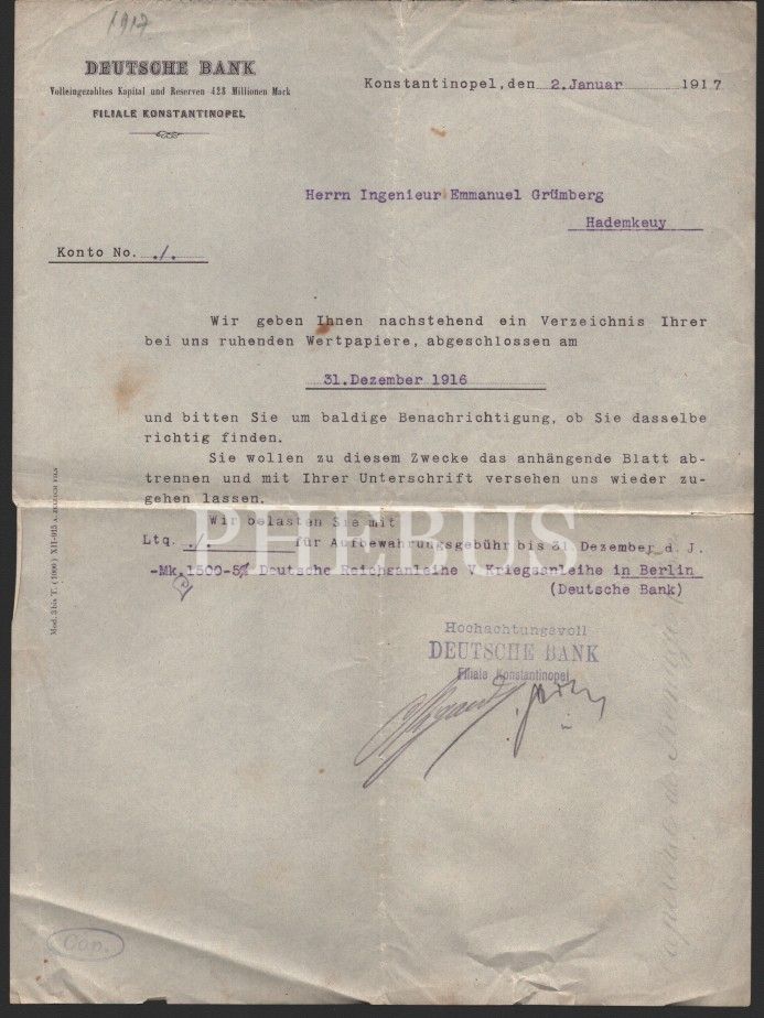 Deutsche Bank antetli Almanca evrak, 1917 tarihli, 20x28 cm