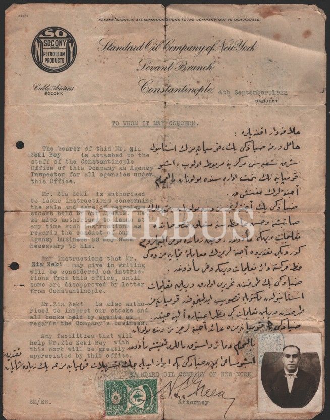 Standard Oil Company of New York antetli İngilizce-Osmanlıca evrak, Constantinople 1923, 21x27 cm