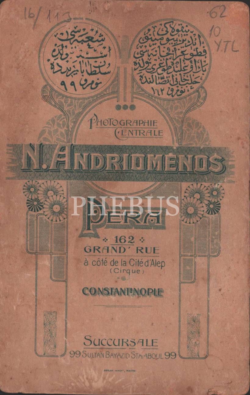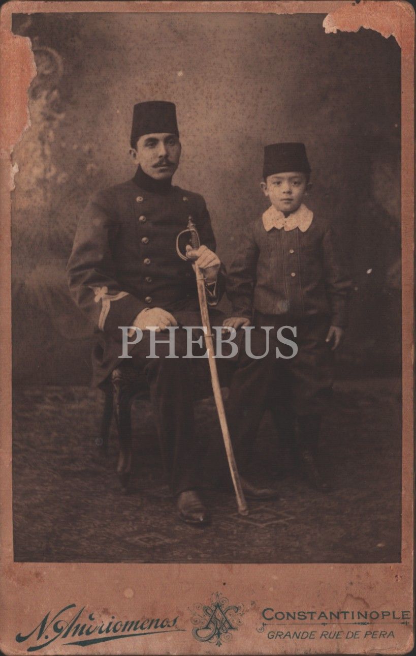 Kılıcıyla poz veren genç Osmanlı askeri ve fesli çocuk, Nicolas Andriomenos Fotoğrafhanesi- Constantinople, 10x16 cm