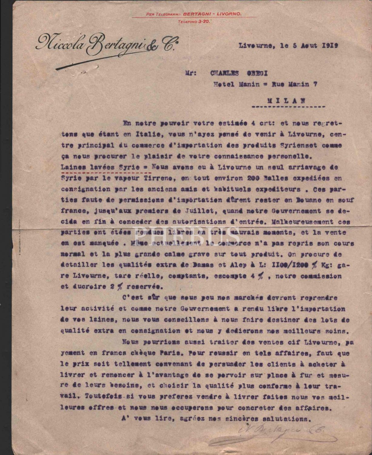 Niccola Bertagni & C. antetli Fransızca mektup, Livorno 1919, 22x28 cm