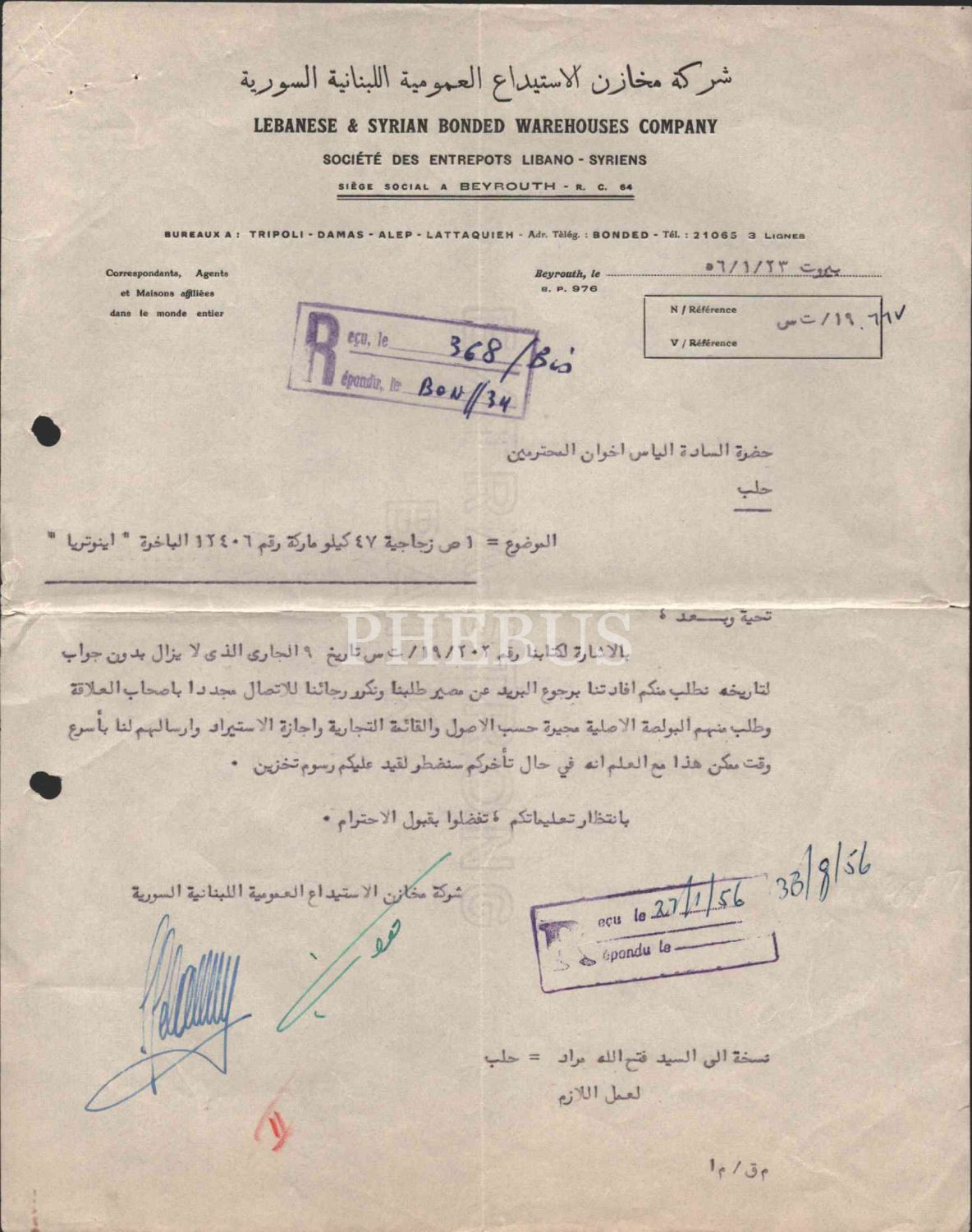 Arapça-İngilizce-Fransızca Lübnan & Suriye Antrepo Şirketi antetli Arapça evrak, Beyrut 1976, 22x28 cm