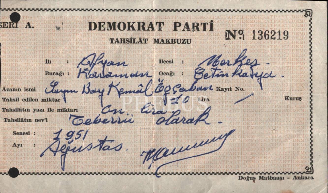 Demokrat Parti'den Kemal Özçoban adına tahsilat makbuzu, 9x18 cm