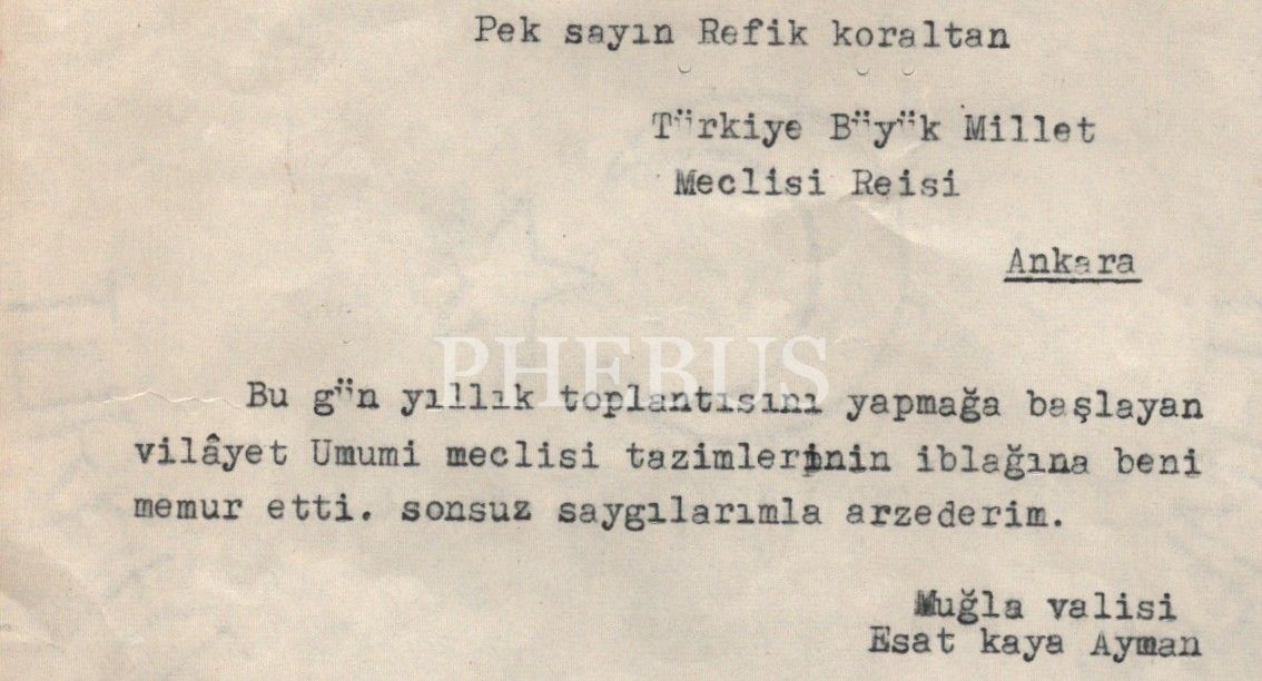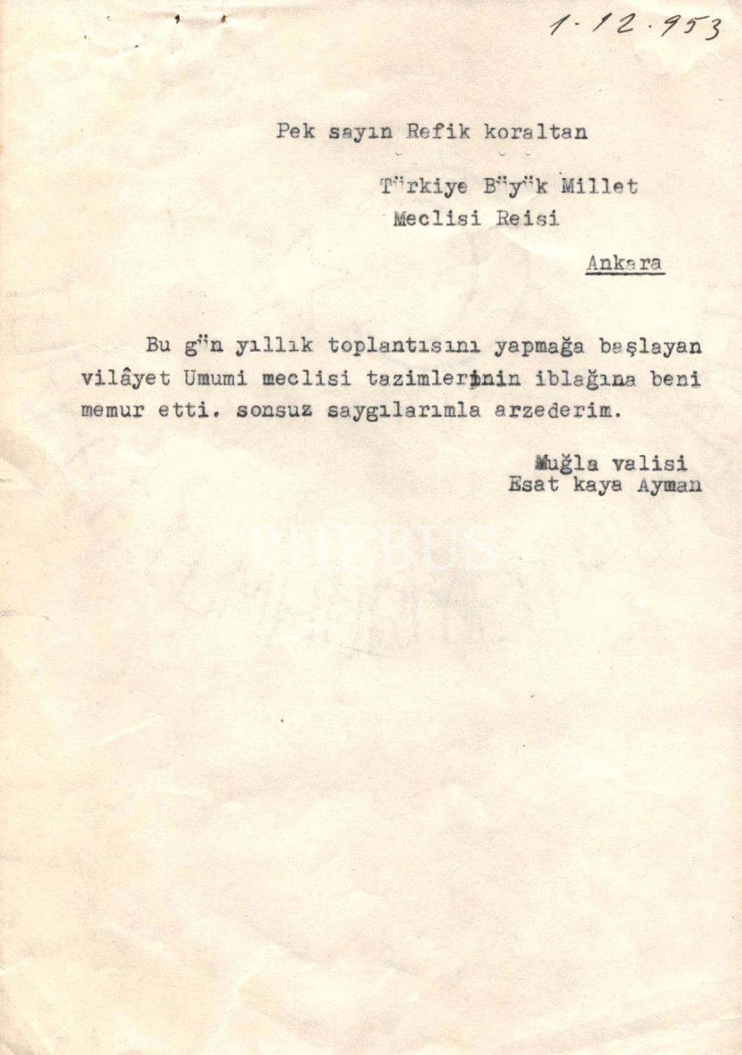 Muğla Valisi Esat Kaya Ayman tarafından Millet Meclisi Reisi Refik Koraltan´a gönderilen dilekçe, 1953 tarihli, 15x21 cm
