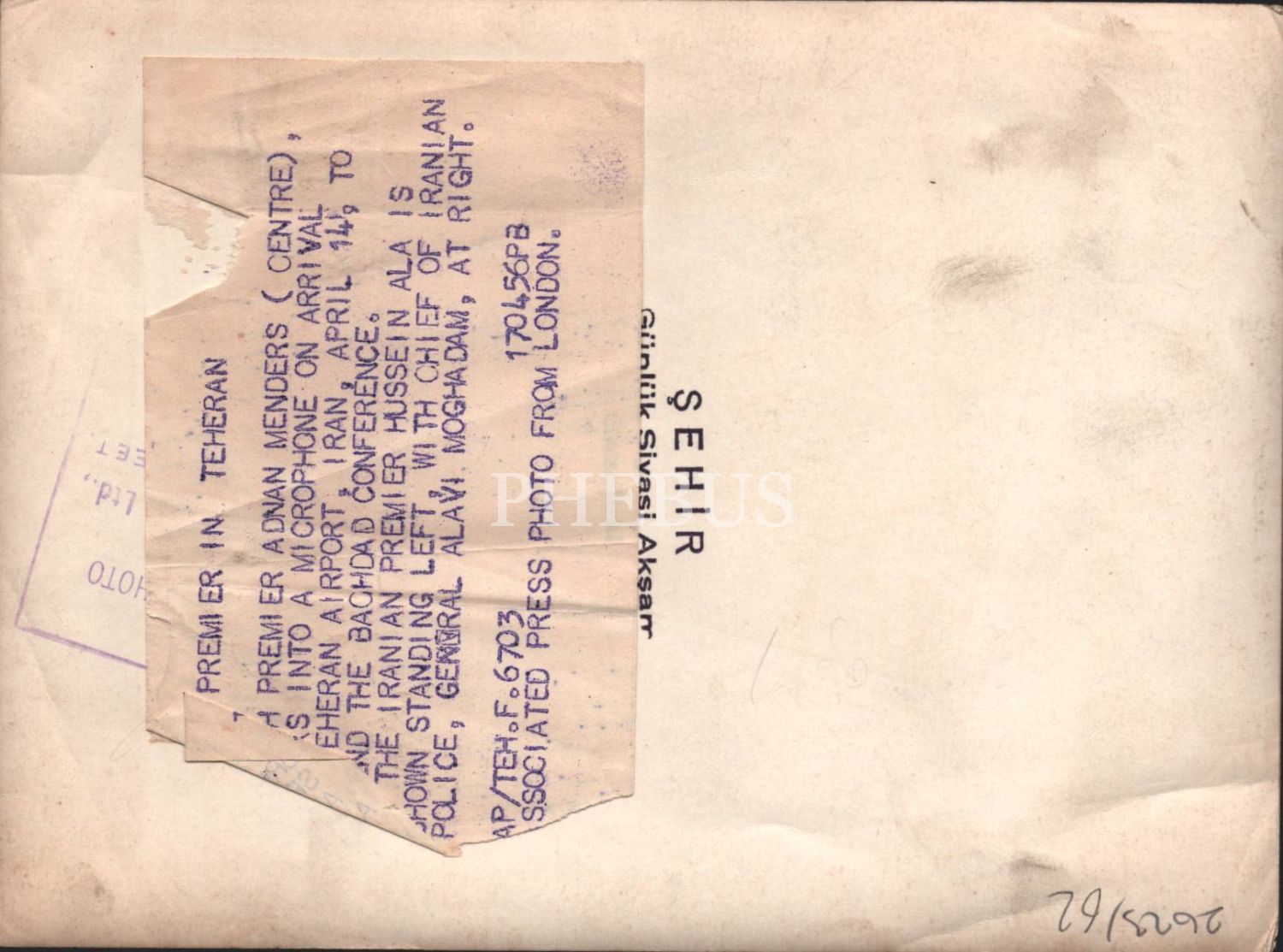 Türkiye Başvekili Adnan Menderes, İran havalimanında İran Başvekili Hüseyin Ala ve İranlı General Alavi Moghadam ile birlikte konuşma yaparken, The Associated Press Ltd.- London ve Şehir Gazetesi kaşeli fotoğraf, 15x20 cm