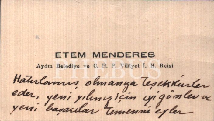 Aydın Belediye Başkanı Etem Menderes´in kartviziti üzerinde el yazısı ile yeni yıl tebriği, 5x9 cm