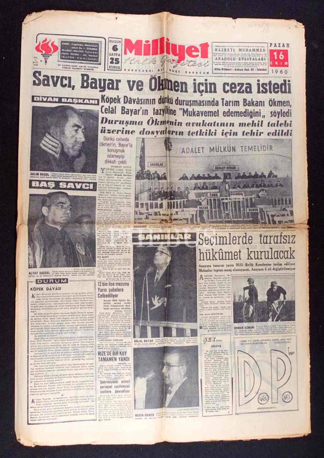 Milliyet gazetesi, "Savcı, Bayar ve Ökmen için ceza istedi" manşetli sayısı, 16 Ekim 1960 tarihli, 43x60 cm
