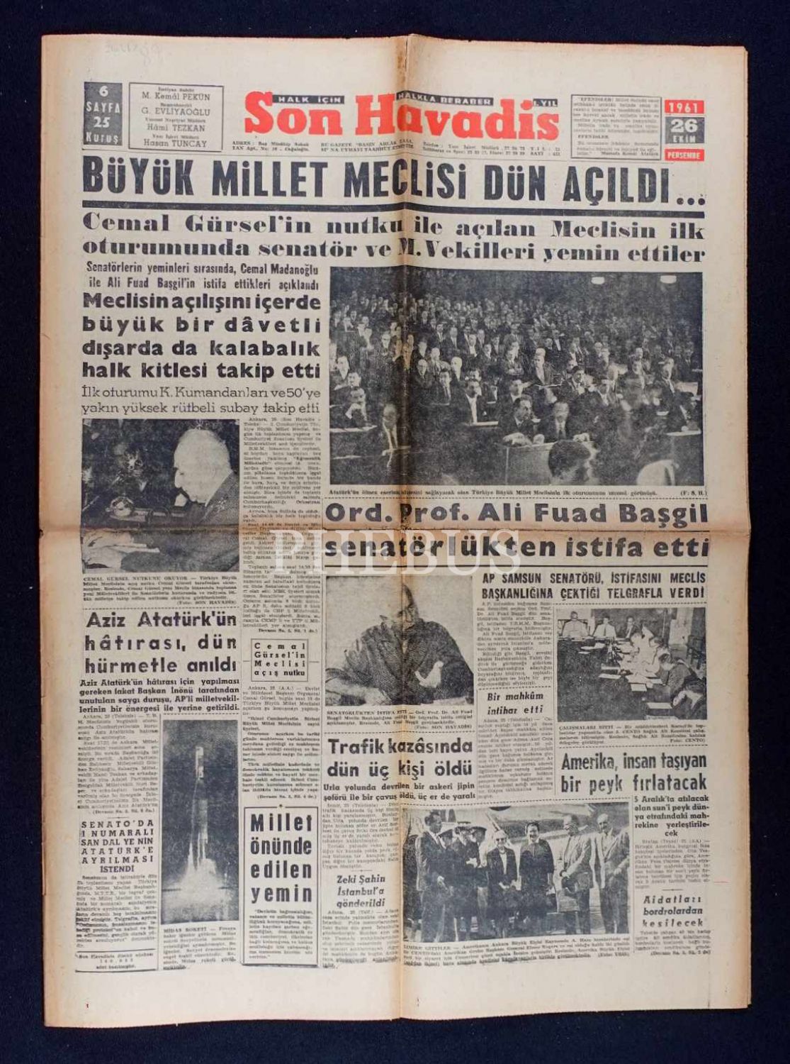 "Büyük Millet Meclisi Dün Açıldı" manşetli Son Havadis gazetesi, 26 Ekim 1961 tarihli, 6 sayfa, 43x60 cm
