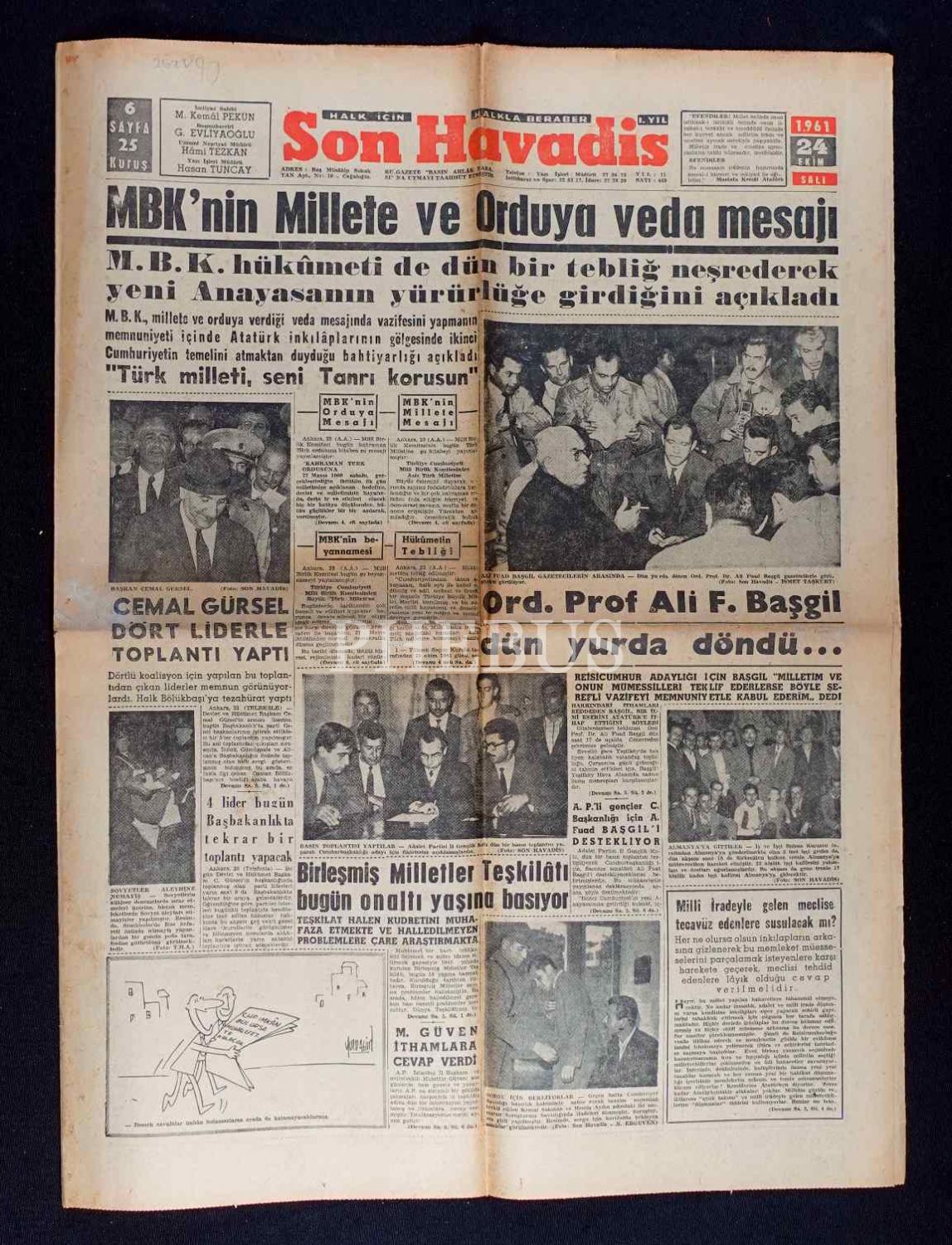"MBK´nın Millete ve Orduya Veda Mesajı" manşetli Son Havadis gazetesi, 24 Ekim 1961 tarihli, 43x60 cm