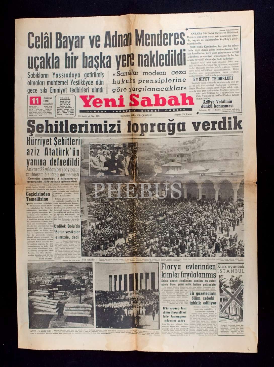 "Celal Bayar ve Adnan Menderes Uçakla Bir Başka Yere Nakledildi" manşetli Yeni Sabah gazetesi, 11 Haziran 1960 tarihli, 43x60 cm