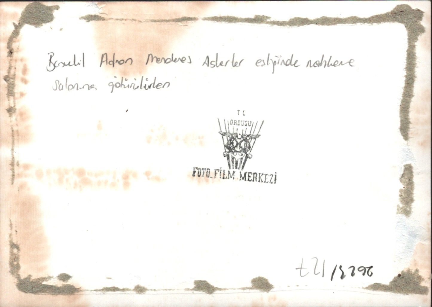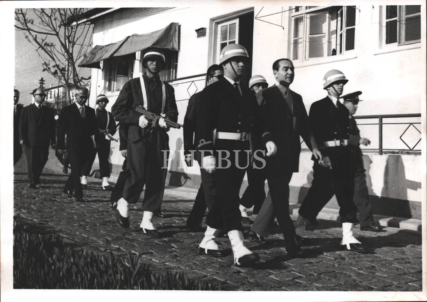 Başvekil Adnan Menderes askerler eşliğinde mahkeme salonuna getirilirken, T.C. Ordusu Foto Film Merkezi kaşeli, 11x17 cm