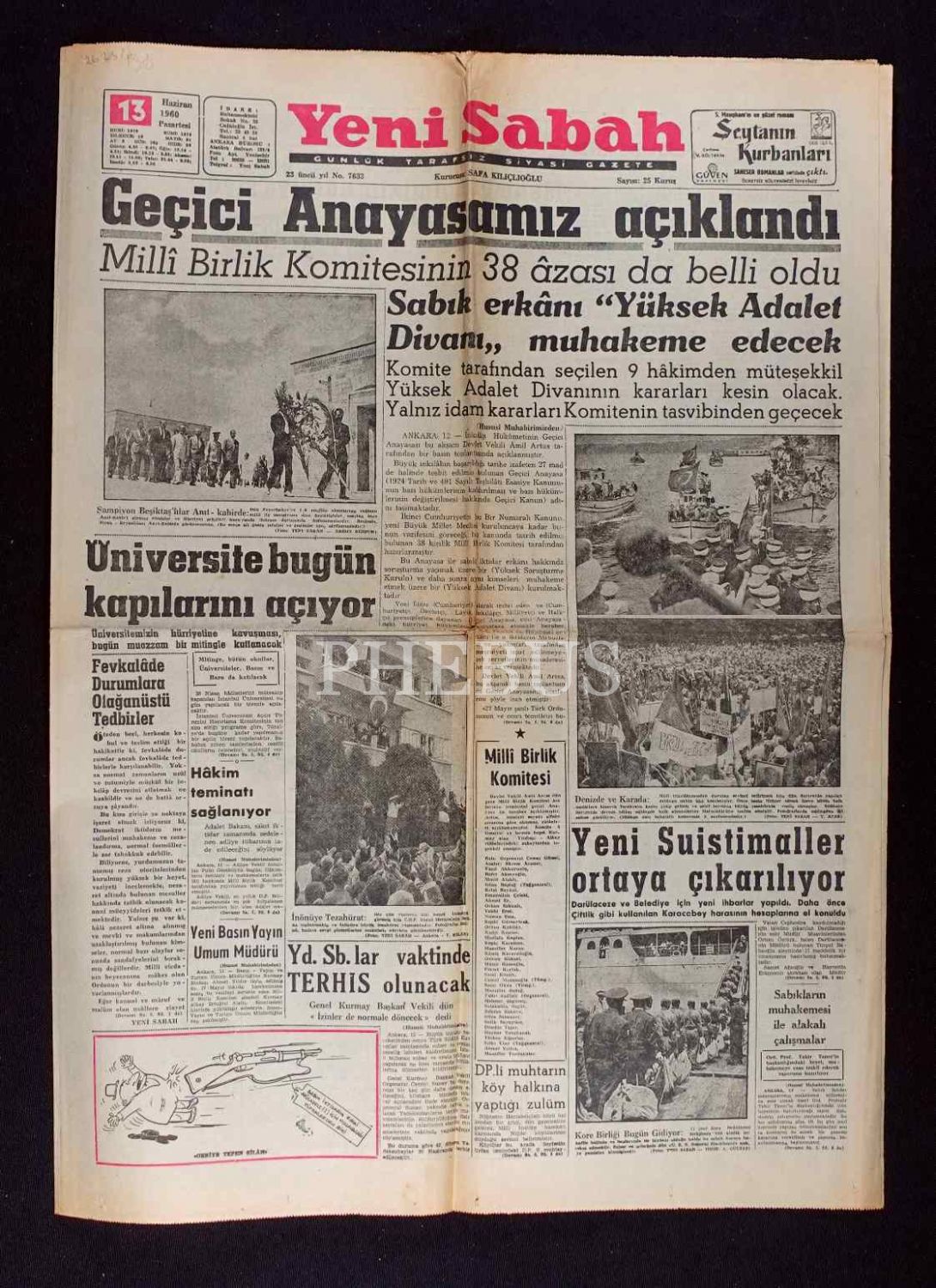 "Geçici Anayasamız Açıklandı" manşetli Yeni Sabah gazetesi, 13 Haziran 1960 tarihli, 43x60 cm